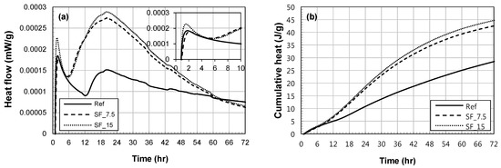 Although the samples with SF emitted more cumulative heats compared to Ref (Figure 3b), there is no noticeable difference in the heats between two samples with SF (the heats are 42.53 J/g and 44.67 J/g in SF_7.5 and SF_15, respectively). Thus, it can be concluded that an excessive addition of SF (e.g., more than 7.5 wt % of SF) scarcely contributes to the enhancement of hydration reaction during heat treatment period. However, it may improve the strength because of the physical filling effect by unreacted SF particles, which will be discussed later.