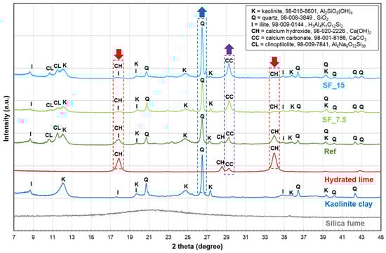 The results of XRD analysis of raw materials and hydrated kaolinite clay-based pastes at 28 days are shown in Figure 4. The kaolinite clay is composed of quartz, kaolinite, and illite. Hydrated lime consists of mostly calcium hydroxide and calcium carbonate. SF contains only amorphous silica. In all hydrated samples, an alumino-silicate type of mineral (clinoptilolite) is found. However, while calcium hydroxide is strongly detected in Ref (see red-dotted boxes in Figure 4), it is almost not detected in samples with SF (SF_7.5 and SF_15). It is obvious that calcium hydroxide was consumed by the pozzolanic reaction induced from the addition of SF [,].