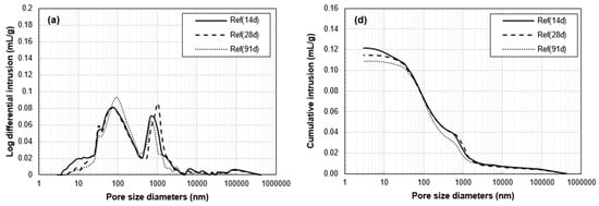 To investigate the porosity and pore size distribution, mercury intrusion porosimetry was used. Three hydration stages of 14, 28, and 91 days were selected, and mercury parameters were set to values of 485 erg/cm2 for the surface tension and 130° for the contact angle.