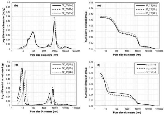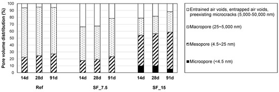 The second peak position of the two samples with SF (SF_7.5 and SF_15) are formed at approximately 10 μm, which is 10 times larger than that in Ref (Figure 5a–c). The pore range of this peak (5–50 μm) is related to preexisting microcracks and entrained or entrapped air []. These pores, which did not change with curing ages, were possibly formed with the change of rheology of the mortar by SF addition [].