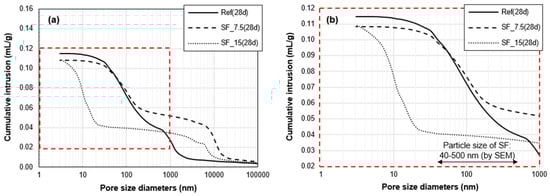 As can be seen in Figure 6 that compares cumulative pore volumes of three samples at 28 days, the extra SF (over 7.5 wt %) is expected to play a role as a filler. Pores of the mortar between 40 and 500 nm in their diameter can be filled with the extra (unreacted) SF, because its size distribution (see Figure 2) coincides with the pore range. Thus, a part of macropores (25 nm–5 μm) [] could be effectively filled with the filler, while increasing the volume of the smaller pores (<25 nm). In short, this filling effect led SF_15 to have fine pore structure (Figure 6b).