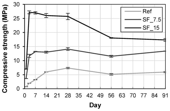 However, the compressive strength dropped between 28 and 56 days in all specimens. Ref reached the maximum strength (7.35 MPa) at 28 days, then the strength decreased by 3.05% at 56 days and increased again by 15.6% at 91 days. The strength of SF_7.5 decreased by 18.1% at 56 days and increased by 15.9% again. On the other hand, a significant strength loss occurred in SF_15 sample without recovery, i.e., the strength steadily decreased after three days until 91 days. In particular, significant strength loss (30%) occurred between 28 and 56 days.