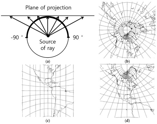 The rectilinear projected image is composed of the points on the plane of projection. It is obtained when the rays from the center of the sphere pass through the points on the surface and cast the points onto the plane. Less than half of the sphere can be projected onto the plane. When the points on the projection plane are located further away from the source of ray, there will be more distortions. Figure 3b shows the projected result of a pole. The opposite hemisphere cannot be projected onto the plane. The distortions are increased away from the pole. Figure 3c shows an equatorial rectilinear projection. Only the points that are within 90 and −90 degrees of the central meridian (0 degrees) can be projected, and the poles cannot be shown. The distortions will be increased away from the central meridian and the Equator. Figure 3d shows an oblique rectilinear projection. If the central parallel is at a northern latitude, its colatitude is projected as a parabolic arc. The parallels in the southern regions are hyperbolas and those in the northern regions are ellipses, which become more concave toward the nearest pole and vice versa if the central parallel is at a southern latitude.