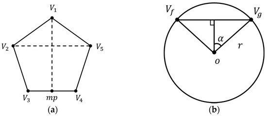 For the dodecahedron, the size of the viewing range is computed using a different method. The width of the viewing range is based on the distance between non-adjacent points, as shown in Figure 7a. The points and are the points and on the sphere in Figure 7b. Then, the can be computed as follows: