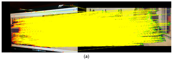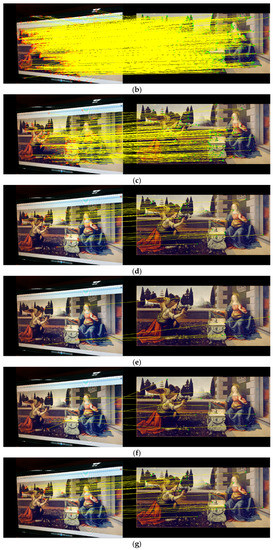 Figure 8b shows a digital image of the original artwork The Annunciation, which has a size of 4057 × 1840. Figure 8a shows an ordinary photograph of the artwork that has a size of 3264 × 2448 and was taken from a 23-inch monitor. Figure 9a–g show the matched keypoints from the SIFT, SURF, MSER, BRISK, FAST, HOG, and FREAK descriptors. For the HOG and FREAK descriptors, the keypoints were detected using the FAST and BRISK methods. The features are well matched because they were extracted from common pictures that are not affected by stitching and projection. In the experimental results section, we show the matched results with 360-degree images.