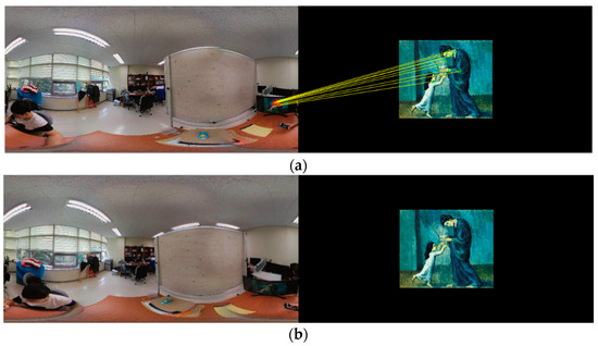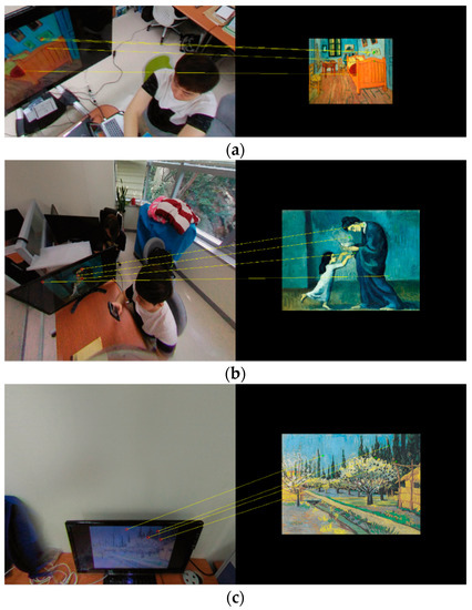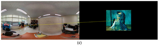 Figure 13a–c show matched results for the artwork The Soup. The artwork is displayed on the 32-inch monitor. Thus, the artwork size is substantially decreased. However, the features are well matched, because the artwork is close to the Equator, as shown in Figure 13a. In Figure 13b, the artwork is shifted towards the south, and there are no matched features. In Figure 13c, after shifting the artwork further away from the Equator, there is a false match. These three matched results suggest that the position has a larger effect on 360-degree image feature matching than the size.