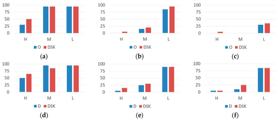 Because SIFT performs best for precision, we show comparisons from before and after applying the DSK for the SIFT using the octahedron and dodecahedron-based methods. In Figure 18, the blue bars are the precision without using the DSK, and the red bars are the precision after applying the DSK. It is clear that the precision after using the DSK is larger than the precision without using the DSK for the H-distortion. Specifically, for the 79-inch monitor, the precision increases 20% and 15% for the octahedron and dodecahedron. For the L-distortion with the dodecahedron, there are no improvements in precision, whereas the precision increases approximately 5% for the octahedron. It is more efficient to combine the DSK with the octahedron. For the 79-inch monitor under the M-distortion using the dodecahedron, there is a decrease in precision after applying the DSK. Occasionally, when the 360-degree image contained the correct artwork, there were several false matches to irrelevant objects. Therefore, based on the mechanism of the DSK, there is a reduction in the similarity between two keypoint shapes. However, overall, the DSK enhances precision.