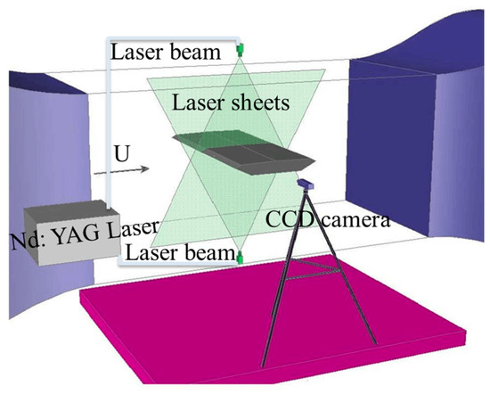 Illumination was provided by a double-pulsed Nd:YAG laser (Vlite 200, Beamtech Optronics Co., Ltd., Beijing, China), which emitted two pulses of 200 mJ at the wavelength of 532 nm with a repetition rate of 2 Hz. The laser sheet was generated by a set of mirrors as well as spherical and cylindrical lenses, which can shape the emitting laser beam. In the measured region, the thickness of the laser sheet was about 1.0 mm. Using two independent laser arms, two laser sheets generated by one laser were manipulated to illuminate both the upper and lower sides of the test models. The laser energy was divided into two parts. This system was elaborately designed and carefully examined by the laser manufacturer. When the center of the target plane was about 1050 mm away from the lens of the laser arms, the laser energy reached the maximum. A 14-bit (1600 × 1200 pixels) CCD (charge-coupled device) camera (pco.1600, PCO AG., Kelheim, Germany) was used to record images for the PIV measurements. The CCD camera and double-pulsed Nd:YAG lasers were connected to a workstation (host computer) via a Digital Delay Generator (Model 575-8C, Berkeley Nucleonics, San Rafael, CA, USA), which controlled the timing of the laser illumination and the image acquisition. The CCD camera was carefully aligned and was perpendicular to the laser planes using the spirit level.