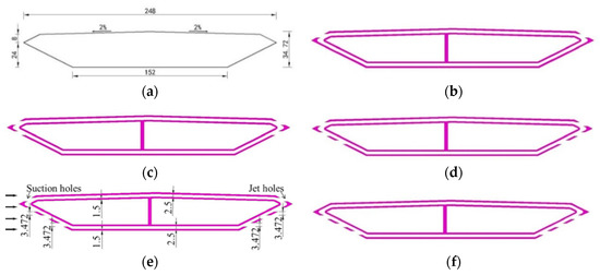 Five test models with bypass passive jet flow control are shown in Figure 2b–f, respectively. The test models for the five control cases have the same external dimensions as Case 0 (Figure 2a). To transport the airflow from the positive side to the negative pressure region and ensure that the upper surface of the girder is not affected, suction/jet holes were only manufactured on the leading/trailing edges of the test models, respectively, which were connected by the hollow channels. As shown in Figure 2e, the height of the connected channel is 2.5 mm, the thickness of the wall is 1.5 mm, and the height of the suction/jet hole is one tenth of the cross-sectional height of the test model (i.e., 3.47 mm). The three suction/jet holes are equidistantly-distributed on the leading and trailing edges of the lower surface. The suction/jet holes of the upper surface are set on the center of the leading/trailing edges of the lower surface, respectively. Combined with Figure 2b–f, the five proposed control schemes are listed in Table 1.