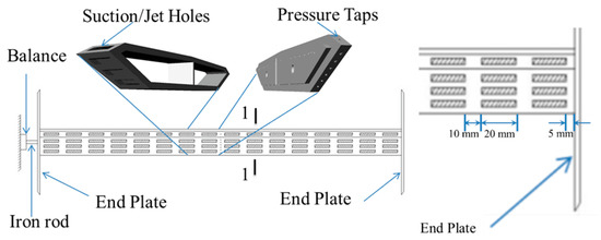 Figure 3 provides a view of the model from the downstream side. Two end plates were installed on both ends of the model to avoid the effects of having free ends and to improve the accuracy of the test results. The length of the suction/jet holes is 20 mm in the span-wise direction, the distance between two neighboring suction/jet holes is 10 mm along the span-wise direction, while the suction/jet holes at both ends are 5 mm from the edge of the model.