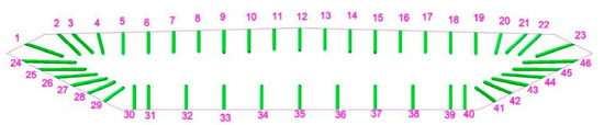 The pressure measurement section was located at the center of the test model (Figure 3). In the present study, 46 taps were arranged around the pressure measurement section (Figure 4). The pressure taps were connected to three units of digital sensor arrays (DSA3217, Scanivalve Corp®, Liberty Lake, WA, USA) by using polyvinyl chloride (PVC) tubes for pressure data acquisition. These PVC tubes had an internal diameter of 0.9 mm and a length of 0.5 m. The precision of the DSA 3217 Model is ±0.05% of the full-scale range (±10 inches of H2O). During the surface pressure measurements, the sampling frequency and time of each pressure tap were set as 312.5 Hz and 32 s, respectively. Based on the work of Irwin et al. [22] and Chen et al. [18], it can be expected that there are relatively small and negligible effects of the tubing system on the pressure measurements for the present test cases, such as the amplitude, attenuation and the phase lag of the instantaneous pressure signals. However, the blockage ratios were 6.67–17.85%, which correspond to the wind attack angle range of 0–20° in the current study. The solid blockage and the wake blockage effects of the test models on the pressure measurements were corrected, as suggested by Barlow et al. [23].