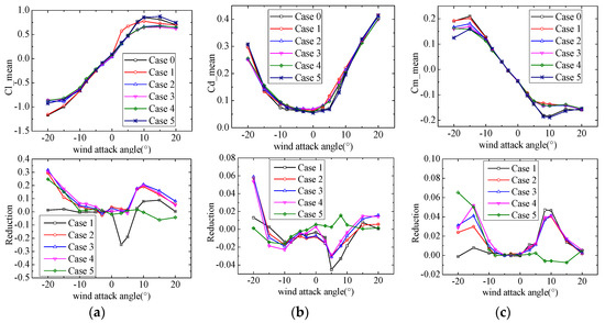 Figure 5 shows the mean values of the lift, drag, and moment coefficients for all test models at wind attack angles ranging from −20° to 20°. The reduction of aerodynamic coefficients is defined as: