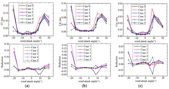 Comparison of aerodynamic force coefficient fluctuations between five control cases and Case 0 at different wind attack angles. (a) Cl_rms; (b) Cd_rms; (c) Cm_rms.