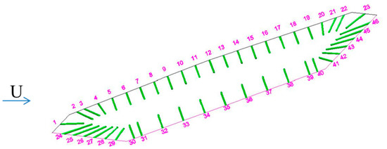 where = 12 m/s is the wind speed of the incoming airflow, which is calculated by the static pressure and total pressure tested by a Pitot tube; B is the width of the test model; is the air density, which was chosen as ; and , and are the drag, lift, and moment per unit length, respectively.