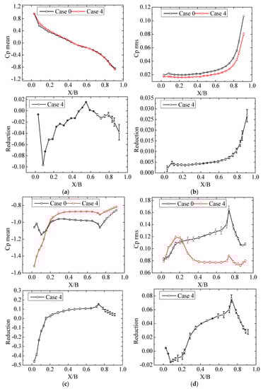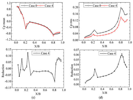 The results shown in Figure 8c,d are similar to those in Figure 7a,b. The mean pressure coefficient distributions of Case 0 and Case 4 are close to each other. The fluctuating pressure coefficients are slightly smaller than the results of Case 0, as shown in Figure 8c,d.