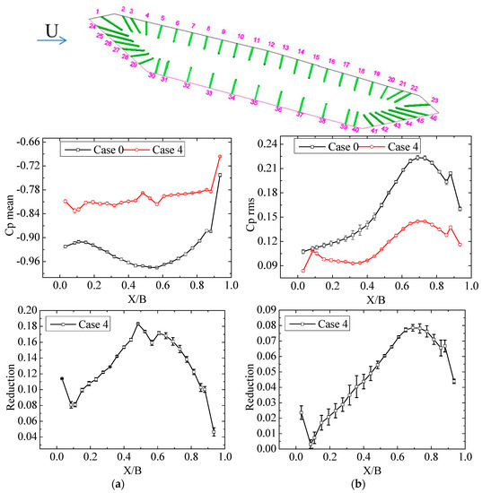 Figure 8 presents the comparisons of the distributions of the mean and fluctuating pressure coefficients around the test models with and without control at a positive wind attack angle of 15°. At this angle, the flow separation is mainly located on the upper surface. On the leeward side of the upper surface, there is a large decrease in mean pressure coefficients and the adverse pressure gradient obtains an obvious reduction (Figure 8a). Following this, there is a dramatic decrease in fluctuating pressure coefficients of Case 4 compared to Case 0 results, as shown in Figure 8d.