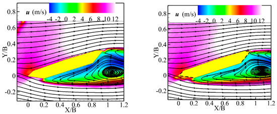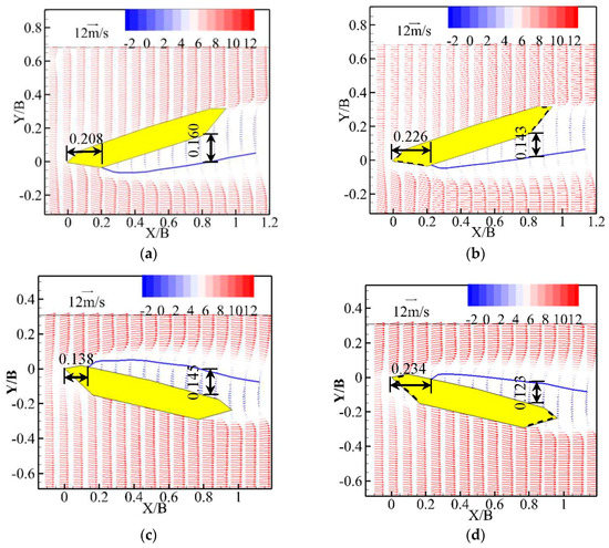 The quantitative analysis of the separation points and the recirculation sizes was then performed, with results shown in Figure 15. The size of the recirculation region is not obvious according the streamlines and vortices; therefore, we conducted an analysis of the velocity profiles near the model surfaces. The blue solid line in Figure 15 in the revised manuscript represents the zero point line of the velocity distribution, and the velocity in the horizontal direction of the position of the model surface separation point is zero. According to these blue lines, we determined the separation points of the flow from the model surfaces. Moreover, the distances between the blue lines and the model surface will reflect the size changes of the recirculation regions. Because 99 × 74 vectors are shown in the fields, the uncertainty may increase by an additional 1/99 × 100% = 1% in the horizontal direction and 1/74 × 100% = 1.4% in the vertical direction under the resolution of PIV measurements. When the wind attack angle was −20°, the flow separation point was X/B = 0.208 away from the leading point for Case 0, while it was delayed to X/B = 0.226 for Case 4. When the wind attack angle was 15°, the flow separation point was X/B = 0.138 for Case 0 before being dramatically pushed down to X/B = 0.234. Then, the recirculation region sizes were quantitatively analyzed when the wind angle was −20°. This quantitative analysis found that the X/B was fixed to 0.8, and the heights of the recirculation regions were 0.160 and 0.143 for Case 0 and Case 4, respectively. The height of the recirculation region was reduced from 0.145 to 0.123 at the angle of 15°. This is consistent with the force and pressure measurement results.