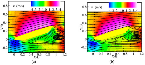 The particle imaging velocimetry (PIV) measurement results for Case 0 and by-pass jet control at wind attack angle of −20°. (a) Case 0; (b) Case 4.