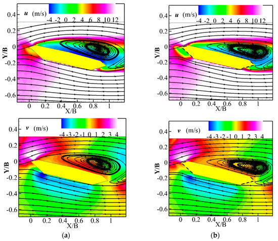 The PIV measurement results for Case 0 and by-pass jet control at wind attack angle of 15°. (a) Case 0; (b) Case 4.