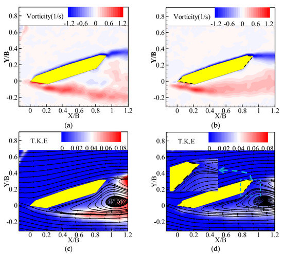 The PIV measurement results for Case 0 and bypass jet control at a wind attack angle of −20°. (a) Instantaneous flow field of Case 0; (b) Instantaneous flow field of Case 4; (c) Time-averaged flow field of Case 0; (d) Time-averaged flow field of Case 4. TKE: turbulence kinetic energy.