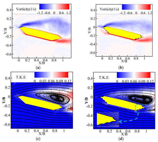 At the wind attack angle of −20°, the instantaneous and time-averaged flow fields are shown in Figure 11. A reverse vortex structure formed on the upper and lower surfaces of the test model of Case 0, which can be seen in Figure 11a. The vortex structure of the upper surface separated from the upper tail of the test model, while the vortex structure of the lower surface separated from the lower leading edge of the test model. The detachment of the unsteady wake vortex structure on the upper and lower surfaces of the model will result in obvious changes in the surface pressure around the model structure. In particular, this happens in the area of flow separation on the lower surface of the test model, as indicated by the surface pressure measurement results given in Figure 7c. For Case 4, the results of the vortex structure around the test model were similar to Case 0, as shown in Figure 11b. However, the vortex strength of Case 4 is lower than that of Case 0, while the wake width is decreased. This is consistent with the fluctuating pressure coefficient distributions, as shown in Figure 7d.