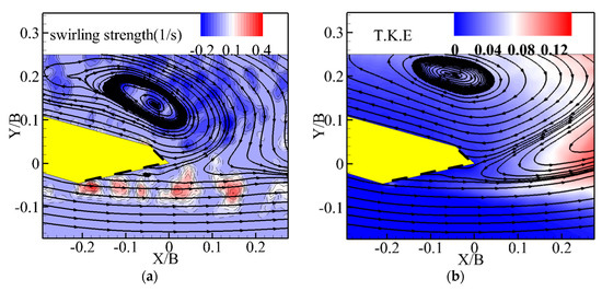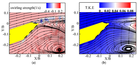 We conducted a detailed experiment focusing on the wake flow behind the test model to investigate the formation of passive jet flow. Here, we adopted swirling strength as the indicator to reveal the jet vortex, as shown in Figure 13a and Figure 14a. It should be noted that the measurement resolution increased to 1.4 mm × 1.4 mm in this case. It can be observed that there are streamlines being evacuated out from the bypass system into the model wake, as shown in Figure 13 and Figure 14.