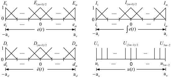 where the controller provides a proportional term, an integration term, and a derivative term. The output and the three inputs , , and can be thought as fuzzy variables in the FLC design. It is assumed that the operating ranges for , , , and are , , , and , respectively. Figure 1 shows the membership functions for graphically defining the four fuzzy variables.