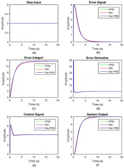 The (a) step input; (b) error signal; (c) error integral; (d) error derivative; (e) control signal and (f) system output with PID controller, the equivalent fuzzy logic controller (FLC), and the equivalent FLC in discrete form.