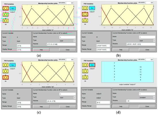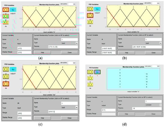 For this case, it shows good results in defining the operating ranges. Furthermore, this is not a limitation as there are four parameters , , , and for adjustment to satisfy the three control parameters , , and in Equation (15). The Fuzzy Logic Designer in Matlab/Simulink was applied for the equivalent FLC design and simulation. Figure 6 shows the feedback control structure.