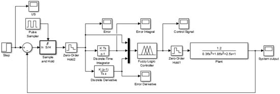 For the equivalent FLC-controlled system in Figure 6, the Matlab/Simulink finishes the simulation in a manner of a continuous-time system. Alternatively, for practical applications, a FLC could be implemented in a discrete form. Therefore, to enhance the applicability of this research, the Sample and Hold unit and the Zero Order Hold unit, which can be used to model A/D (analog-to-digital) and D/A (digital-to-analog) converters, are added to make a discretized FLC, as shown in Figure 9. It must be noted that the Fuzzy Logic Controller in Figure 6 and Figure 9 are identical. So, in Figure 9, the gain (K) in the “Discrete-Time Integrator” or “Discrete Derivative” does not denote or , and is set as 1. The system input and the resulting responses (blue line) are shown in Figure 5, with sampling period set as 0.1 s. Simulation results show the equivalent FLC implemented in a discrete form have similar responses compared with the conventional PID controller. If the sampling period is set to a smaller value, the closer of the two responses will be obtained.