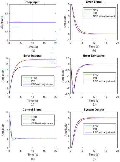 The (a) step input; (b) error signal; (c) error integral; (d) error derivative; (e) control signal and (f) system output with PID controller, the equivalent FLC, and the equivalent FLC under MFs adjustment.