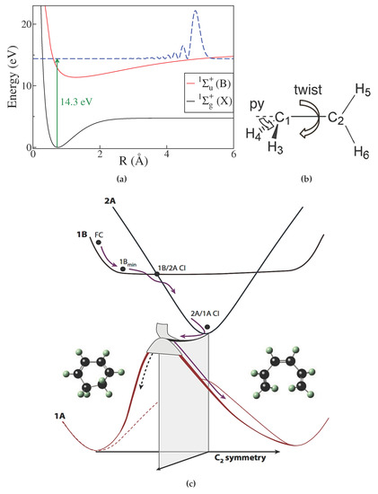 Overview of the molecules and dynamics discussed in this article. (a) D2: Potential energy curves for the ground and excited state potential energy curves. The vibrational wavepacket is excited onto the state centered on vibrational state = 38 by a eV pump pulse. The wavepacket (dashed line) is shown at the outer turning point; (b) Ethylene: After excitation to the state, the dynamics is dominated by C–C bond twist, pyramidalization, and changes in C–C bond length; (c) 1,3-cyclohexadiene (CHD): Upon excitation from the 1A ground state onto the 1B bright state in the Franck–Condon region, the molecule decays through a sequence of conical intersections back to the ground state in either the ring-open or ring-closed form (based on illustration in Ref. [54]).
