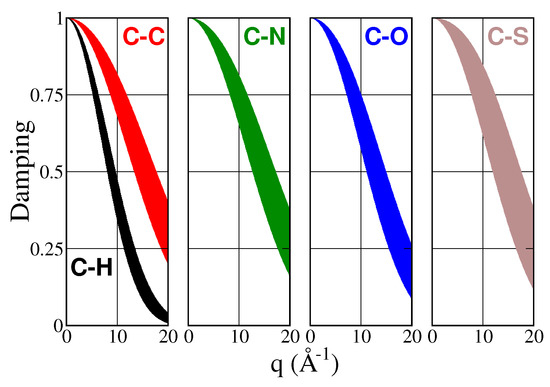 Damping factors (see Equation (14)) as a function of momentum transfer q (Å) calculated using frozen Gaussian widths from Thompson et al. [76] for scattering from the following pairs of atoms: C−H, C−C, C−N, C−O, and C−S. The damping is given for , where are the standard deviations in the fitted widths [76].