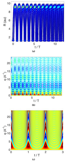 Results for D2 excited to the electronic B-state by a eV pulse with 20 fs duration. (a) Contour plot of the D2 vibrational wavepacket probability density, , with R the internuclear distance in Bohr and t the time; (b) Contour plot of the corresponding modified (elastic) scattering intensity for the wavepacket, with q the momentum transfer in Å and t the time; (c) Contour plot of the modified (elastic) scattering intensity for the classical D2 molecule, shown over three oscillation periods, . Note that in all three plots the time t is given in units of the classic oscillation period fs. The modified scattering intensity is defined in Equation (16), and we use the form factor for H in the denominator.