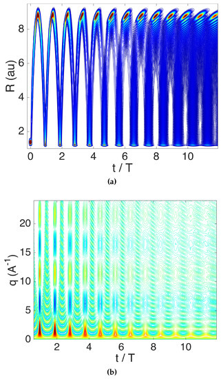 One possible objection to using D2 as an example, despite the fact that the modified molecular intensity minimizes the effect of the atomic form factors on the scattering, is that D2 is not an obvious candidate for a scattering experiment and that its small reduced mass exaggerates delocalization. We have therefore performed the same calculation but with a higher reduced mass corresponding to the potassium dimer, K. In order to aid comparison, we have not changed the potential, i.e., the potential energy curve remains that of the D2 B-state, and all parameters except the reduced mass are left unchanged. We refer to this wavepacket as to avoid confusion with actual K. We first consider the wavepacket, which is plotted in Figure 4a. The greater reduced mass leads to a significant increase in the density of vibrational states, and thus in the number of eigenstates contained in the wavepacket in Equation (2). As a consequence, initial localization is stronger than in D2, but conversely, the dispersion at longer times (on the normalized timescale) is also greater. The scattering from the wavepacket, shown in Figure 4b, is thus more defined at earlier time, but suffers more from the dispersion of the wavepacket at larger multiples of the characteristic period, which leads to a more marked degradation of the diffraction signal at large values of q.