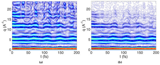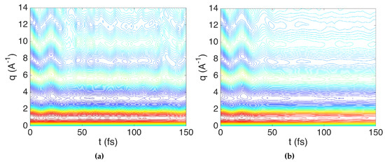 Contour plots of modified (elastic) scattering intensity, , for the photoexcited dynamics of ethylene. Time in fs and momentum transfer q in Å, with defined in Equation (16) (we use form factors for the C-atom in the denominator). (a) A small set of 20 trajectories; (b) A large set of 1000 trajectories, giving a better representation of dispersion of the wavepacket at long times.
