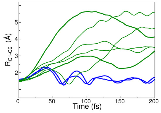 Representative C−C bondlength distances for the bond that breaks during the 1,3-cyclohexadiene (CHD) ring-opening reaction, shown as a function of time. Reproduced from Ref. [6]. Trajectories in blue lead back to the ring-closed form, while trajectories in green lead to the ring-open form of the molecule.