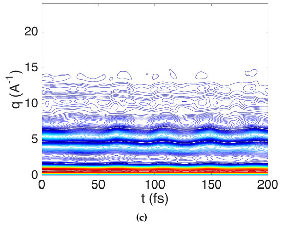 Contour plots of modified (elastic) scattering intensity, , for the ring-opening reaction of 1,3-cyclohexadiene (CHD) [6]. Time in fs and momentum transfer q in Å, with defined in Equation (16) (we use C-atom form factors in the denominator). (a) Perfectly localized trajectories with ; (b) Standard values of the width parameters ; (c) Increased width, i.e., more delocalized wavepackets, obtained via half-value width parameters.