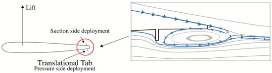 Microtabs (MT) concept and enlargement view of the streamlines around the MT mounted on the pressure side of an airfoil [].