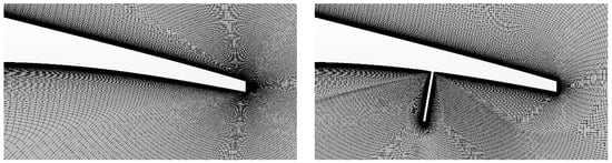 The Reynolds number based on the airfoil chord length of c = 1 m is Re = 7 × 106. The computational setup of the simulations consists of a structured mesh with the first cell height ∆z/c of 1.45 × 10−6 normalized by the airfoil chord length. The stretching in the chord-wise and normal directions is accomplished by double sided tanh stretching functions based on Vinokur [] and Thompson et al. []. The mesh domain was designed to have a dimensionless distance less than 1 (y+ < 1) on the airfoil wall. An optimized mesh plays a major role in the CFD simulations as the tool that will help the user to discretize the domain. It is important to identify the mesh regions where the results have to be quite accurate as well as to establish a balance between the accuracy of the simulations and the computational cost. Figure 3 shows the cell distribution around the MT and in the near wake of the trailing edge. The wake and the regions where high gradients were expected were accordingly refined. There are certain regions close to the MT in which the velocity gradient changes drastically, which is the reason why those areas are so important.