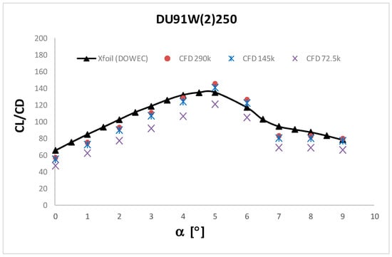 In OpenFoam, both the velocity and the pressure conditions have to be defined at all boundaries, since the velocity-pressure coupling is based on a collocated grid approach. Non-slip boundary condition was set for the airfoil and MT walls. Computational simulations of the DU91(2)250 airfoil without any MT have been carried out and validated against the data obtained by Xfoil from DOWEC project of Kooijman et al. [] and Lindenburg []. The Lift-to-drag ratio was calculated for ten angles of attack (AoA) from α = 0 to α = 9 degrees. Figure 4 shows the results of the CFD computations against the Xfoil results for all angles of attacks of the airfoil.