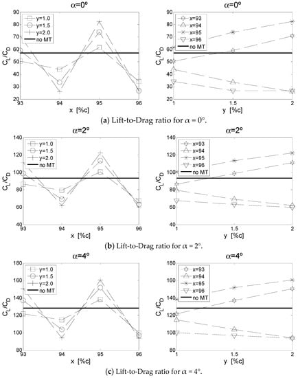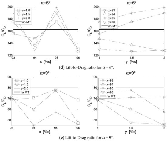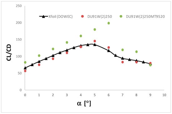 For the range of angles of attack, from 0° to 9°, the best values of the CL/CD ratio are reached by the cases MT9510, MT9515 and MT9520. However, as can be seen in the left column plots of Figure 7, the highest values are reached around the x = 95% of the chord length. On the right column plots, it is clear again that the best values of the Lift-to-drag ratio are reached by x = 95% of c, and the highest ones by the MT height of y = 2% of c. Therefore, in the range of angles of attack studied in the present work, the best case in terms of Lift-to-drag ratio is the one defined by: x = 95% and y = 2% of c. These results are in concordance previous studies of Yen et al. [] where it was found that the best place to situate the lower surface tab with respect to lift and drag was around 95%c. According to the classification of Table 1, that case corresponds to DU912250MT9520. The CL/CD ratio achieved in that case, keeps up to the ratio of the clean airfoil represented in Figure 7 with a continuous black line. Figure 8 illustrates the Lift-to-drag ratio values of the case DU912250MT9520 in comparison with the ratios obtained for the clean airfoil.