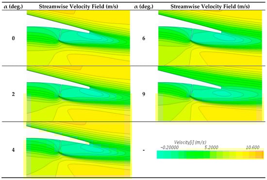 Streamwise velocity fields of the case DU91W(2)250MT9520 at angles of attack α = 0°, 2°, 4°, 6° and 9°.