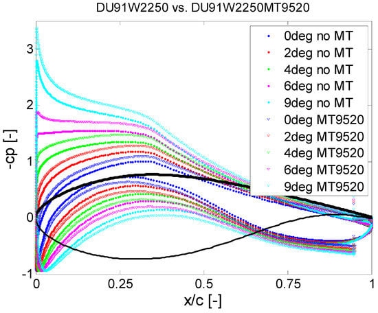 A comparison of the pressure distribution on the surface of the clean airfoil DU91W(2)250 and the airfoil with the best aerodynamic performance in terms of lit-to-drag ratio DU91W(2)250MT9520 is presented in Figure 10. The presence of the MT considerably increases the aft loading of the airfoil and a positive gap between the clean and the microtabed airfoil is clearly visible at all angles of attack. The airfoil shape is sketched by a continuous black line.