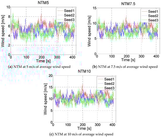 The velocity spectra of the IECKAI model are assumed to be invariant across the grid. In practice, a small amount of variation in the u-component standard deviation occurs due to the spatial coherence model. Figure 11 represents the wind speed series used in the present study according to the Normal Turbulence model with 5 m/s, 7.5 m/s and with 10 m/s average velocity, respectively. According to TurbSim user specifications, the first input value is a random seed that must be an integer between −2,147,483,648 and 2,147,483,647 (inclusive). In the current study, three different seeds have been chosen for each wind realizations. Figure 11a–c illustrates the wind patterns generated for each wind speed. The values of Seeds 1–3 have been chosen to obtain different wind patterns and are the same for each average wind speed.