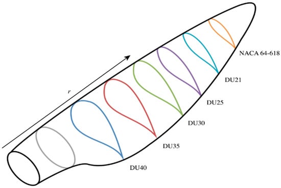 Sketch of the airfoil distribution along the blade (not to scale) of the NREL 5 MW wind turbine according to [].