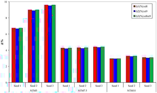 At the wind speed realization of NTM5, the greatest increase in the average power was achieved by the case st8, with a value of 5.3218 × 105 W, which supposes an increase of 9.599% in comparison with the value obtained by the clean wind turbine. Moreover, the other cases with MTs mounted on st9 and st8st9 present a similar increase. At the NTM7.5 wind speed realization, the largest increment average power output was reached by the case with the MTs implemented in the station 8 of the blade, with an increase of the power in compared with the clean wind turbine of 4.425%. At the NTM10 wind speed realization the largest average power value is reached by the case with the MTs mounted on st8 with an increase with respect to the clean case of 3.282%. The largest increases for the three wind speed realization used in the present work have been performed by the case with the MTs in the blade station 8, corresponding to the case DU91W(2)250MT9520st8. Figure 14 illustrates in a bar plot the increments in the power output for every case in comparison with the clean case. The effect of mounting MTs on the blade stations studied in the present work is more significant at low wind speeds than at wind speed close to the nominal power. At those low wind speeds, the MTs can help to increase notably the wind turbine power output performance. Note that even thought the case DU91W(2)250MT9520st8st9 has more MTs mounted along the blade, its power performance in terms of average power output is quite similar in comparison with the other cases with MTs on stations 8 and 9.