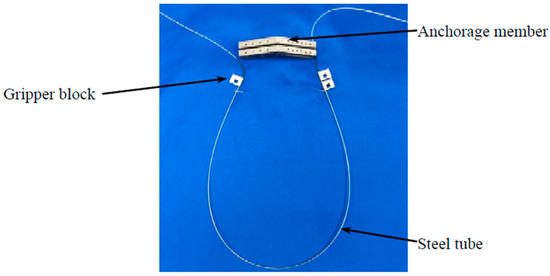 Figure 1 and Figure 2 present the schematic diagram and the photo of FBG strain hoop sensor, respectively. This sensor is comprised of an FBG sensor, two capillary copper tubes, three gripper blocks and a steel tube. The fiber in both sides of an FBG is packaged with the epoxy resin in the two capillary copper tubes. The steel tube is used to protect the fragile bare fiber from damage. Meanwhile, the steel tube is mounted on the outer surface of the pipeline, providing a track for the capillary copper tubes slide in it. The two gripper blocks fixed on the steel tube are temporarily jammed in an anchorage member when bonding the steel tube to the outer surface of the pipeline, ensuring that the steel tube can be closely mounted onto the pipeline surface. After bonding the steel tube to the pipeline, the two gripper blocks at the movable end and the fixed end are jammed in an anchorage member (as shown in Figure 2). The movable end shifts position when a circumferential deformation happens, which, in turn, drags the gripper block, causing deformation in the grating area and the gripper tubes.