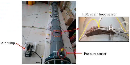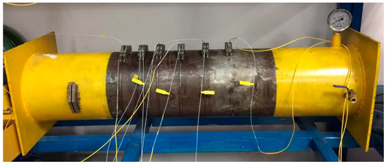To characterize the working performance of the FBG strain hoop sensor, the calibration tests were conducted on a steel pipe model with the outer diameter 219 mm and wall thickness 6 mm, which is the same as the actual pipeline used for experiment. The test model is presented in Figure 4. The internal pressure was loaded by a water pump with a maximum pressure of 1.5 MPa. During the test, the pipe model was loaded step by step continuously from 0 KPa to 500 KPa at an interval of 100 KPa.