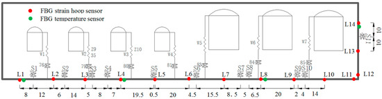 The sensitive coefficient, reflecting the relationship between the pressure and hoop strain, is a key parameter for the FBG strain hoop sensor. As shown in Figure 5, the sensitivity coefficient of the FBG strain hoop sensors is 9.79 KPa/με and the hoop strain measured by the FBG strain hoop sensor is linear to the inner pressure from the first to the fifth load step, demonstrating that the FBG strain hoop sensor is sensitive to the pressure variation. Therefore, leakage monitoring is viable based on an FBG strain hoop sensor. Fourteen FBG strain hoop sensors’ sensitive coefficients were extracted and shown in Figure 6. Obviously, the sensitive coefficients fluctuate around the value of 10 KPa/με, indicating that the FBG strain hoop sensor has stable performance since the packaging mechanism of the sensor has no adverse effect on the hoop strain measurement.